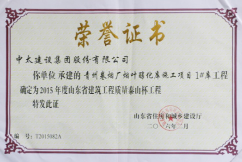 “泰山杯”獎是山東省建筑行業(yè)工程質(zhì)量方面的最高榮譽獎,由山東省建設(shè)廳、山東省建筑工程管理局、山東省建筑業(yè)聯(lián)合會頒發(fā)。獲獎工程位于山東省青州市玲瓏山北路1818號,項目總投資6700萬元,建筑內(nèi)容為41196平方米煙葉醇化庫主體和部分配套項目,工程自2012年11月20日開工建設(shè),于2013年11月20日竣工驗收完成。
