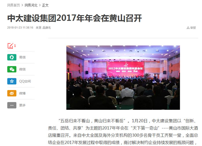 網(wǎng)易報道了“中太建設集團2017年年會在黃山召開”