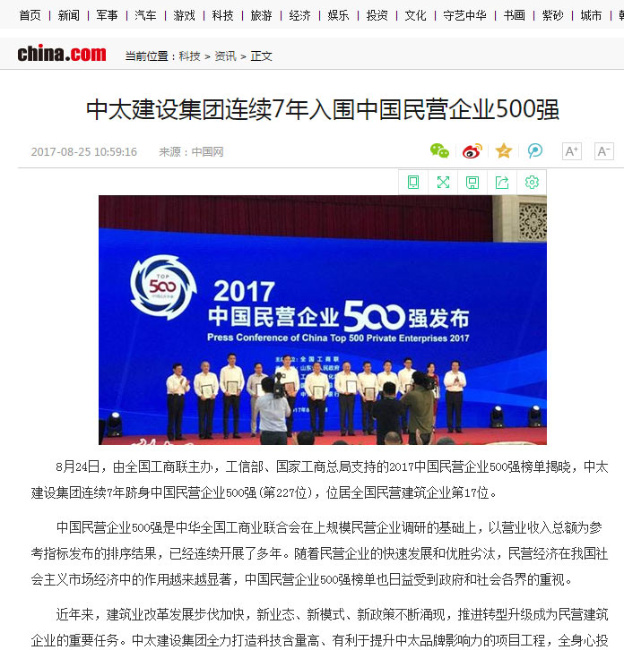 中華網報道了“中太建設集團連續7年入圍中國民營企業500強”