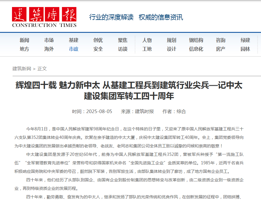 建筑時報8月5日報道了輝煌四十載 魅力新中太 從基建工程兵到建筑行業(yè)尖兵——記中太建設(shè)集團軍轉(zhuǎn)工四十周年
