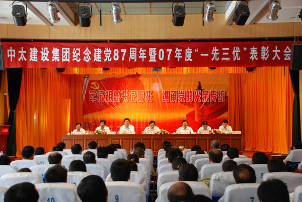 為了傳承黨的光榮傳統(tǒng),激勵(lì)士氣、鼓舞干勁,進(jìn)一步動(dòng)員全體黨員職工,以中共中央總書記、國(guó)家主席、中央軍委主席胡錦濤同志視察集團(tuán)公司為動(dòng)力,把當(dāng)前抗震救災(zāi)凝聚出來的力量和精神,運(yùn)用到實(shí)際工作中,轉(zhuǎn)化為推動(dòng)企業(yè)向前發(fā)展的強(qiáng)大動(dòng)力,團(tuán)結(jié)一致、攜手并進(jìn),為全面完成好年初公司既定的各項(xiàng)任務(wù)指標(biāo)、實(shí)現(xiàn)集團(tuán)公司又好又快的發(fā)展而努力奮斗。6月28日上午,中太建設(shè)集團(tuán)黨委在中太大廈二樓報(bào)告廳召開紀(jì)念中國(guó)共產(chǎn)黨成立八十七周年暨07年度“一先三優(yōu)”表彰大會(huì)。集團(tuán)黨委班子成員,受表彰的“一先三優(yōu)”先進(jìn)集體代表與優(yōu)秀個(gè)人,集團(tuán)公司總部,三個(gè)事業(yè)部全體黨員與全體員工,各黨支部班子成員與部分黨員、入黨積極分子共計(jì)200多人參加了表彰會(huì)。中太建設(shè)集團(tuán)公司黨委副書記、監(jiān)事會(huì)主席鐘崇鶴主持會(huì)議,集團(tuán)公司黨委委員、總裁張明禮宣讀了表彰的先進(jìn)黨支部、優(yōu)秀共產(chǎn)黨員、優(yōu)秀黨務(wù)工作者、優(yōu)秀黨小組長(zhǎng)名單,集團(tuán)黨委書記、董事局主席李文健作了重要講話,。