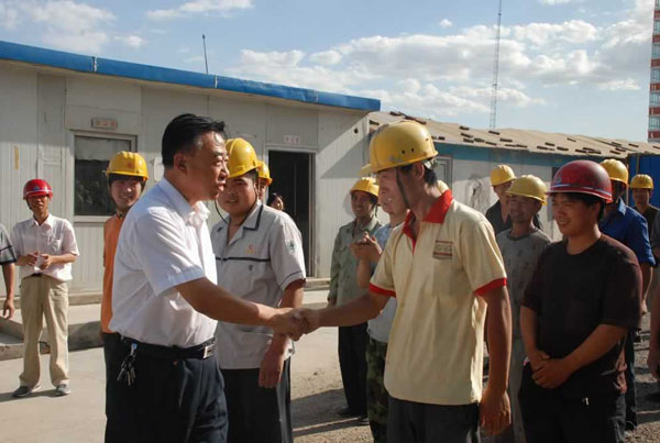 6月30日下午,市人大副主任、總工會(huì)主席王瑞峰代表市總工會(huì)來(lái)到集團(tuán)九公司“龍河盛都”項(xiàng)目施工現(xiàn)場(chǎng),看望慰問(wèn)在炎熱酷暑下,仍然堅(jiān)持施工的一線工人,并送來(lái)了白糖、毛巾、綠豆、礦泉水等防暑降溫慰問(wèn)物品。市總工會(huì)黨組書記、常務(wù)副主席關(guān)景發(fā)、副主席王泰山、市建設(shè)局工會(huì)主任王克峰等領(lǐng)導(dǎo)同志和集團(tuán)工會(huì)主席鐘崇鶴、建設(shè)集團(tuán)副總經(jīng)理林維生陪同慰問(wèn)。