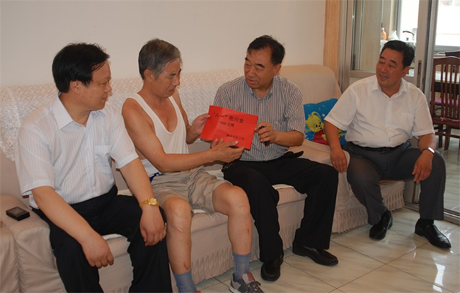 在八一建軍節到臨之際,727日上午,廊坊市人大副主任、市總工會主席王瑞峰(右二)、廊坊市總工會黨組書記、常務副主席關景發(右一),市總工會副主席王泰山在廊坊市建設局黨委委員、系統工會主任王克峰等領導同志的陪同下,來到集團公司第一生活區家屬院,看望慰問公司因病家庭困難的軍轉干部劉國清(左二),代表市總工會向劉國清表示節日慰問,并頒發了慰問金。中太建設集團黨委書記、董事局主席李文健(左一)陪同慰問。