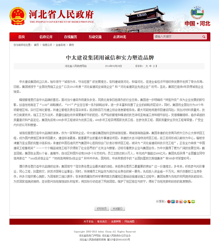 河北人民政府網(wǎng)站報(bào)道了中太建設(shè)集團(tuán)用誠信和實(shí)力塑造品牌