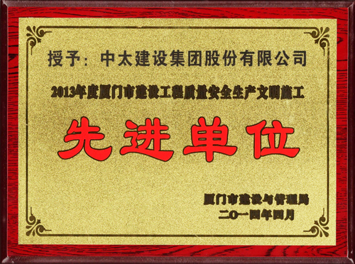 近日,中太建設集團榮獲2013年度“廈門市創建安全文明工地優勝單位”、“廈門市建設工程質量安全生產文明施工先進單位”、“廈門市創建優質工程優勝單位。何波、曹仰高被評為先進個人。(第九工程局)