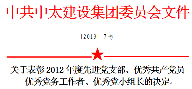 2012年度,集團公司各級黨組織堅持以科學發展觀為指導,按照集團黨委的總體要求,緊緊圍繞“一園兩翼,多元發展,實現中太產業結構轉型升級”和“三個跨越、四個一體化”的戰略發展目標,堅持“打中太牌,走全國路,謀海外財”的發展方針,深入貫徹落實黨的十八大精神,結合黨委開展的“三抓三帶”活動,團結帶領廣大黨員積極創先爭優,服務中心工作,為推動企業持續、健康、和諧發展發揮了黨組織的戰斗堡壘作用和政治保障作用;廣大黨員在各自的崗位上勤奮工作、勇挑重擔,發揮了黨員的模范帶頭作用,涌現出了一批業績突出的先進集體和優秀個人。為表彰先進,樹立典型,充分發揮榜樣的示范作用,激勵黨員和員工見賢思齊,全面推動集團公司科學健康發展,在紀念中國共產黨建黨92周年之際,集團黨委決定,對混凝土公司黨支部等8個“先進黨支部”、林維生等39名“優秀共產黨員”、楊召國等9名“優秀黨務工作者”、閆建薇等10名“優秀黨小組長”予以通報表彰。