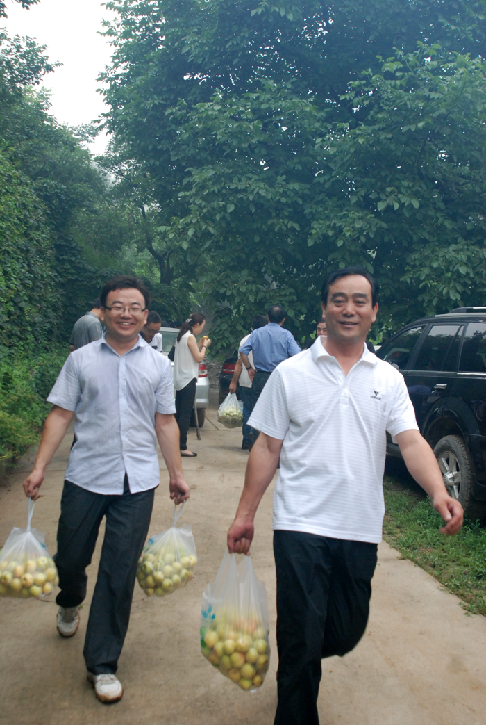 從京承高速公路下道,兩輛大巴車沿著崎嶇山路緩慢行駛。山道兩側灌木郁郁蔥蔥,置身于這天然氧吧,清新的空氣順暢地能讓人一下子呼吸到了丹田而心神氣爽。一路上,路邊采摘的果園比比皆是。空氣中那果實散發出的清香,直入心脾,令人口舌生津。